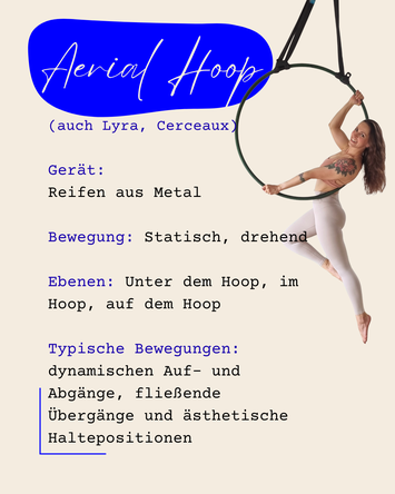 Das Aerial Hoop, auch Lyra oder Cerceau/Cerceaux genannt, ist ein Ring aus Metall, der an einem oder zwei Aufhängungspunkten von der Decke hängt und an dem verschiedene Übungen ausgeführt werden. Aerial Hoop trainiert besonders die Muskelgruppen der Arme, Schultern, Bauch und Rücken. Um eine Dysbalance zu vermeiden werden zusätzliche Übungen für den Unterkörper mit eingebaut.